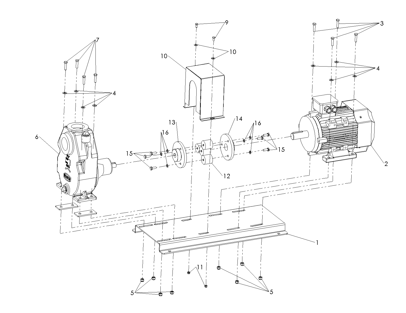 Combinaison d'une pompe auto amorçante (avec palier et arbre nu) et d'un moteur électrique montés sur un bâti