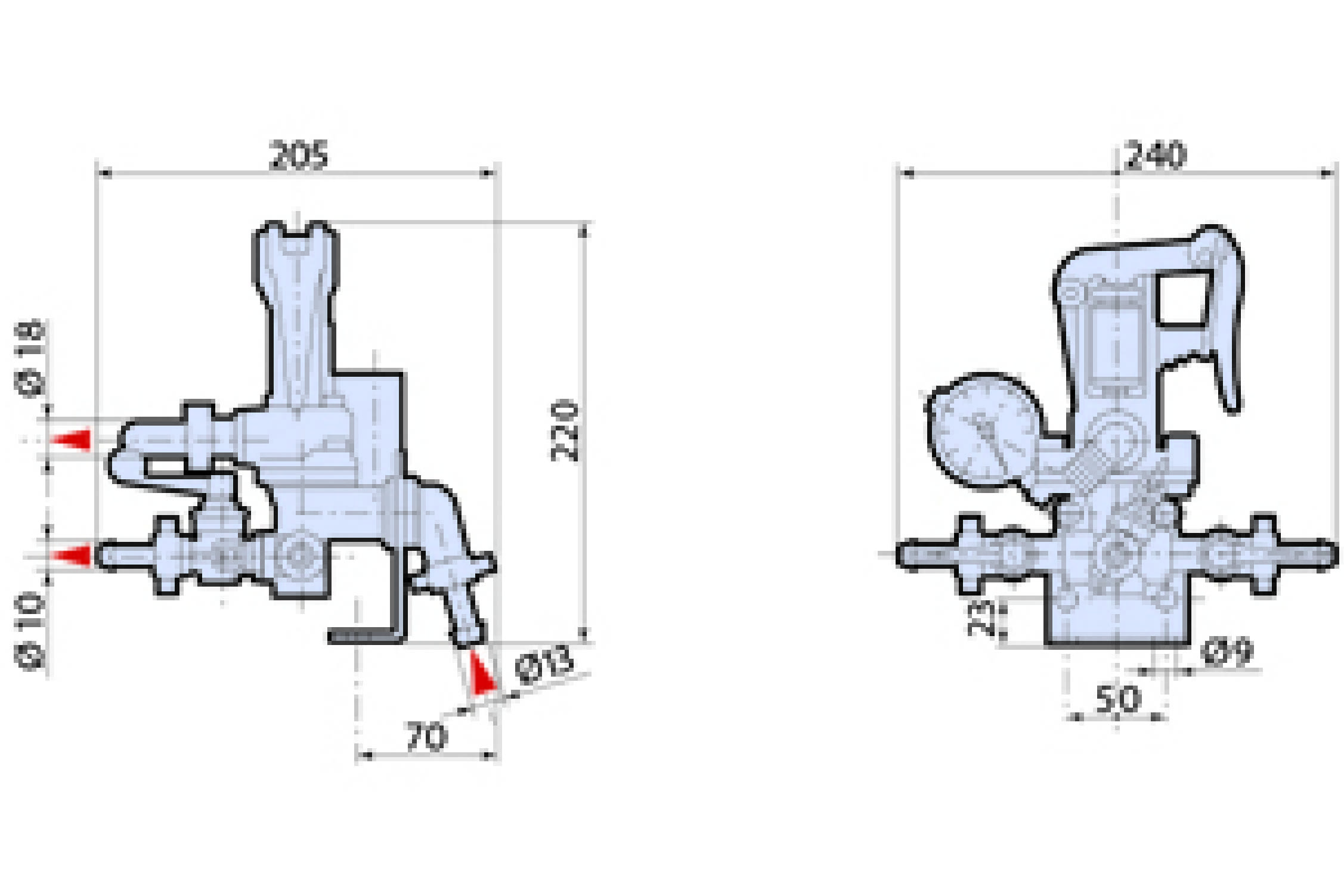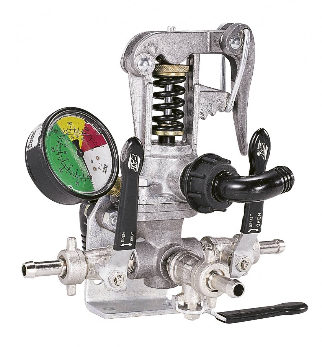 Groupe de commande avec vanne de régulation de pression de travail, levier d’ouverture/fermeture et manomètre avec cadran coloré.