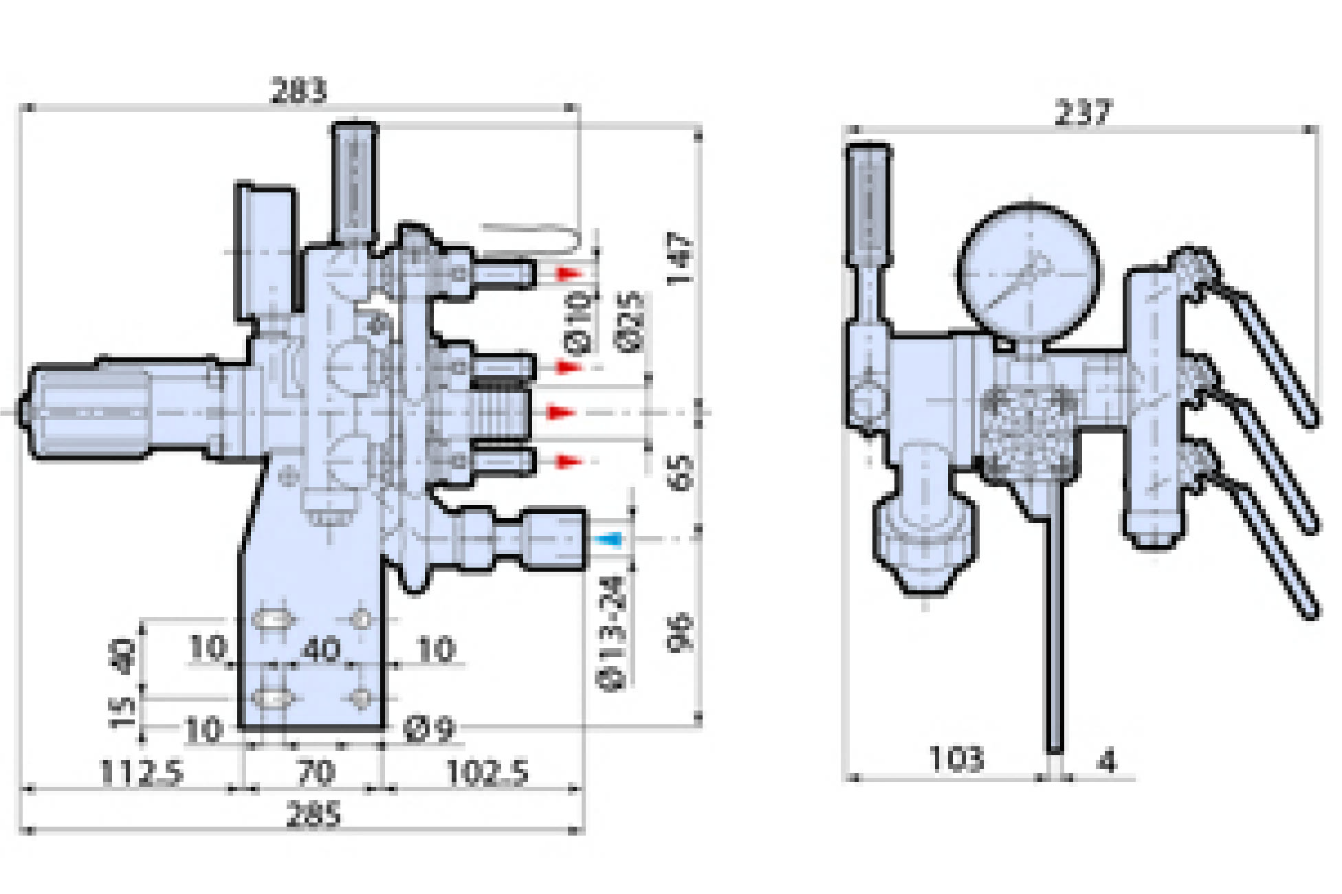 Groupe de commande avec vanne de régulation de pression de travail, levier d’ouverture/fermeture et manomètre avec cadran coloré.