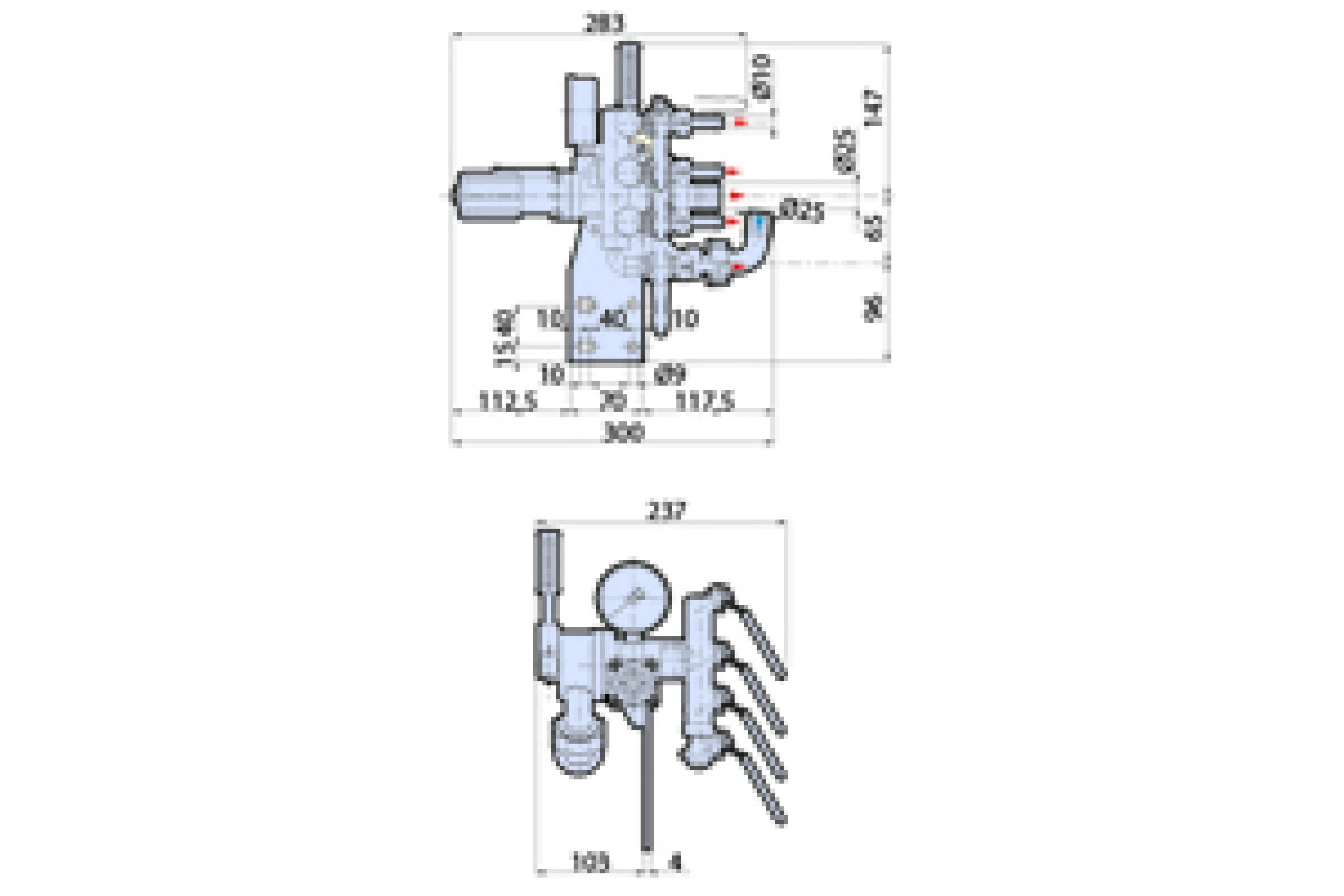 Groupe de commande avec vanne de régulation de pression de travail, levier d’ouverture/fermeture et équipé d’un manomètre avec cadran coloré.