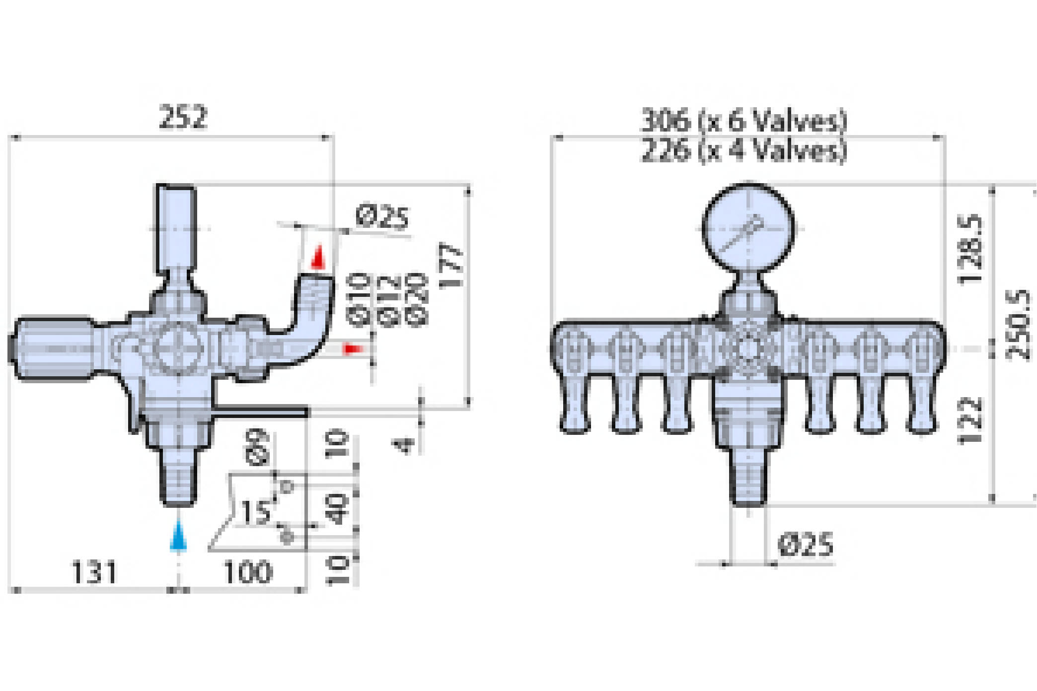 Groupe de commande avec vanne de régulation de pression de travail et équipé d’un manomètre avec cadran coloré.