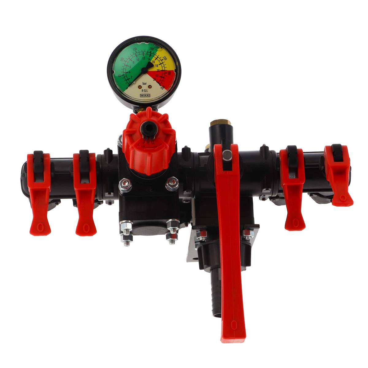 Groupe de commande avec vanne de régulation de pression de travail, levier d’ouverture/fermeture, anti-goutte, vannes pour réguler la dépression et manomètre avec cadran coloré.