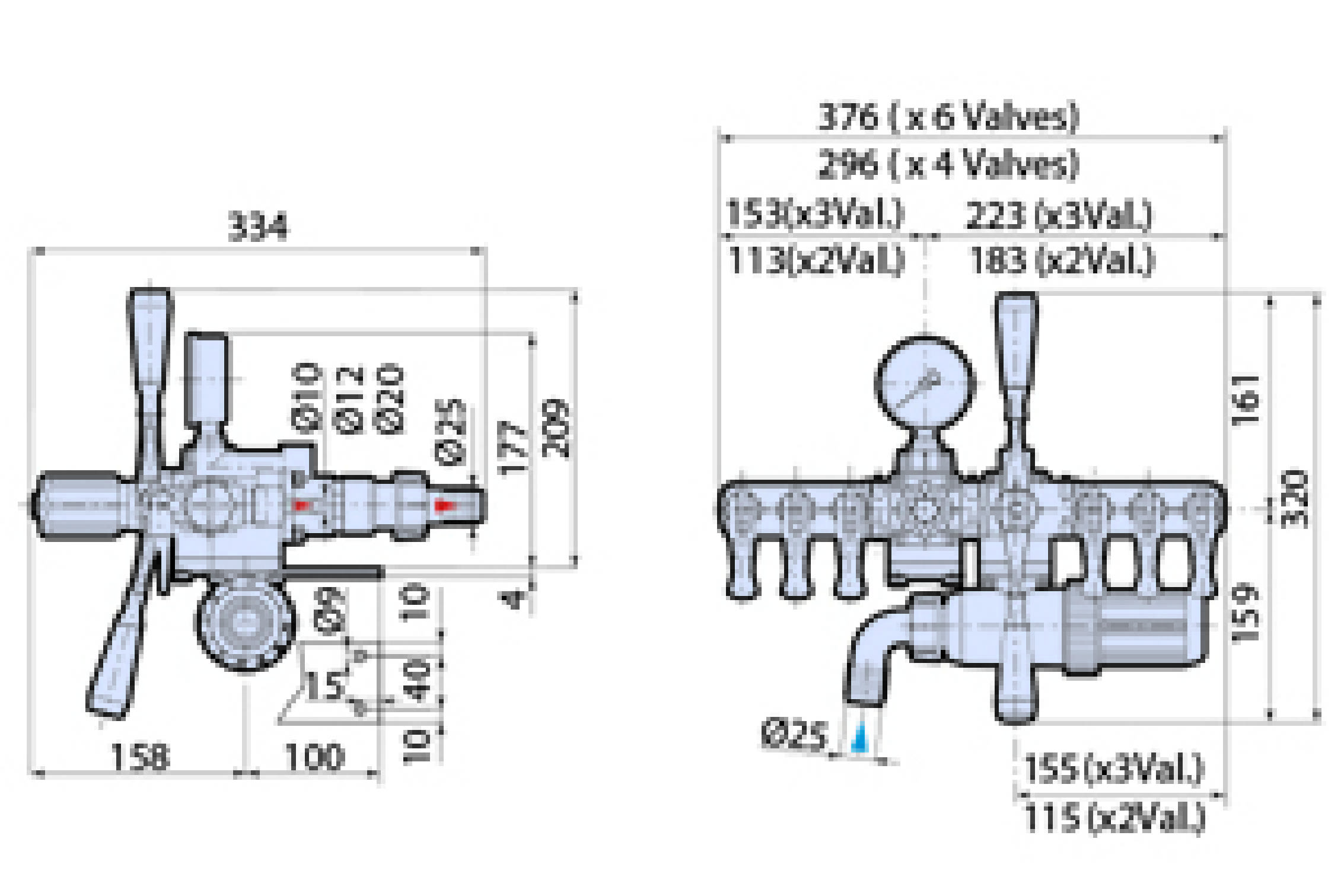 Groupe de commande avec vanne de régulation de pression de travail, levier d’ouverture/fermeture, anti-goutte, vannes pour réguler la dépression et manomètre avec cadran coloré.