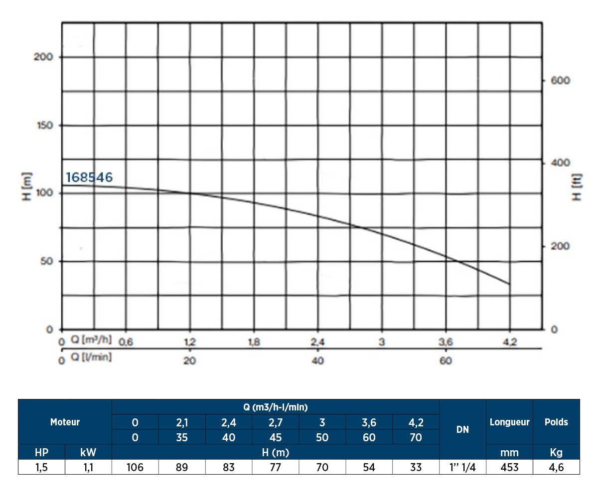 Pompe de forage de diamètre 4’’ 60 l/min à bain d'eau monophasée 1.1kW pour usages industriels ou agricoles (hydraulique + moteur à bain d'eau)