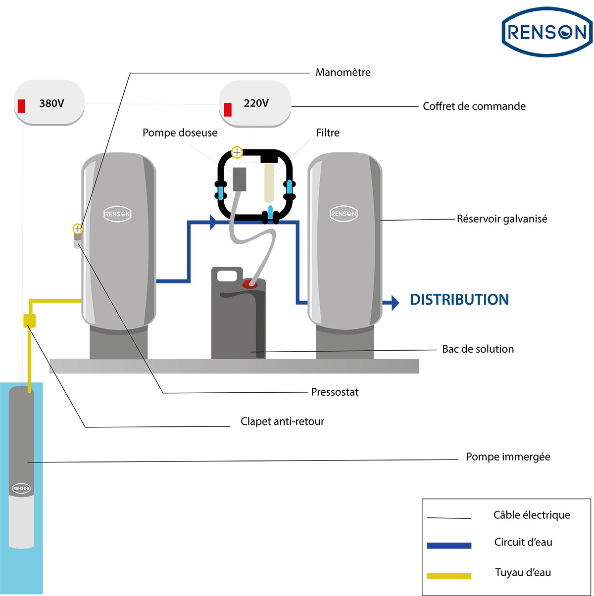 Nos techniciens vous recommandent une installation dite en « dosage proportionnelle » , c’est-à-dire que la pompe est connectée à un compteur à impulsion permettant un dosage plus précis et constant.