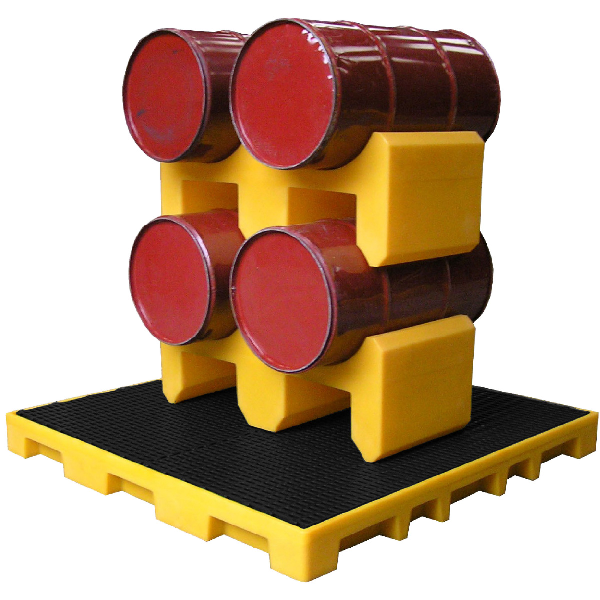 Support de fut 2 x 60 L gerbable. Il est fabriqué en polyéthylène haut densité (PEHD). Il mesure (L x p x h) 860 x 390 x 320 mm. Ce support permet de stoker les futs à l'horizontale, sous le support des passages pour les pales de matériel de manutention. Cela permet de déplacer les futs plus facilement. Il est possible de poser un second support sur les futs comme sur la photo ci-dessus.