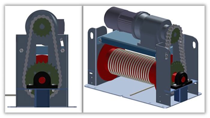 Les treuils sont de conception robuste (en acier galvanisé) avec un entraînement pignon-chaîne ainsi qu’un moteur réducteur qui entraîne une faible consommation électrique.