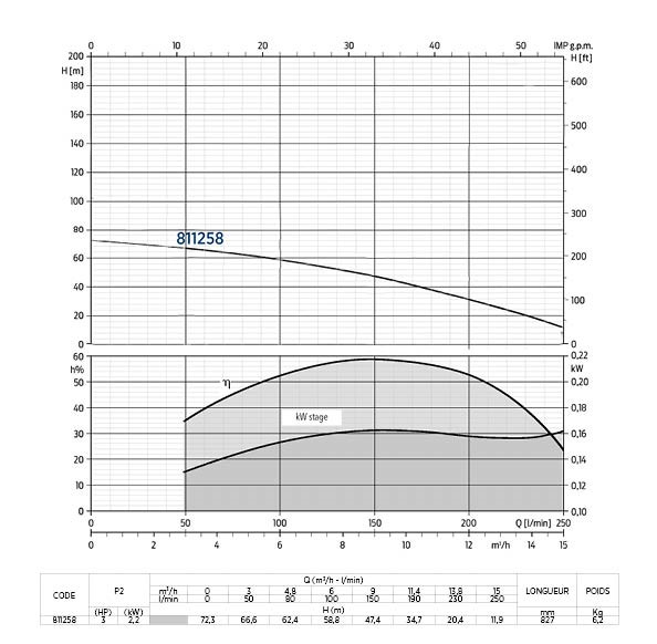 - Débit maximum (Q): 15 m3/h ; 250 l/min