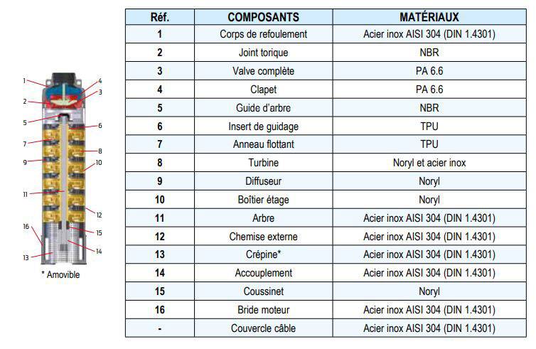 • Corps de refoulement et bride de raccordement en techno polymère, solide et résistant à une eau acide (valeur de ph basse) et à une eau ferrugineuse.