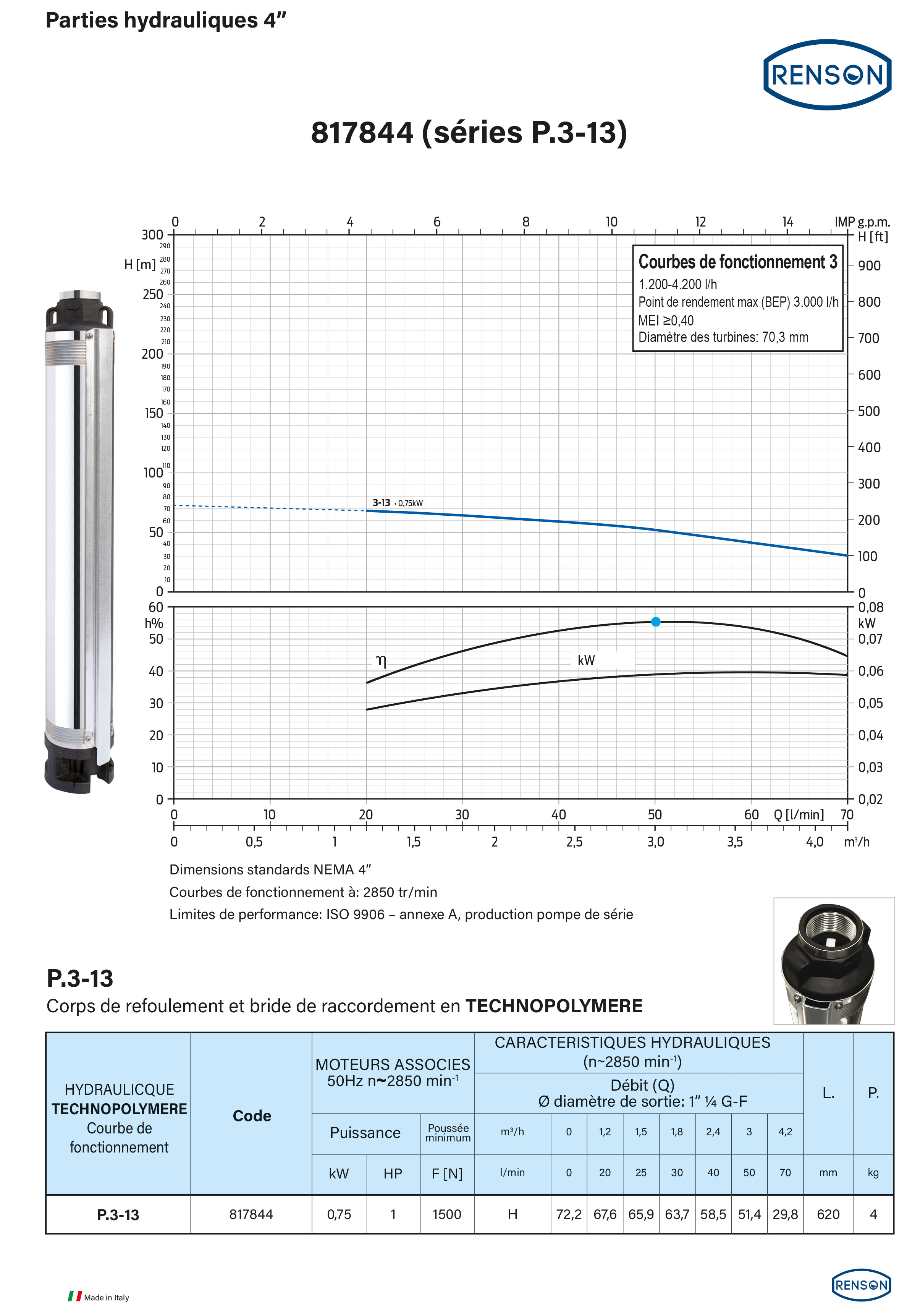 • Corps de refoulement et bride de raccordement en techno polymère, solide et résistant à une eau acide (valeur de ph basse) et à une eau ferrugineuse.