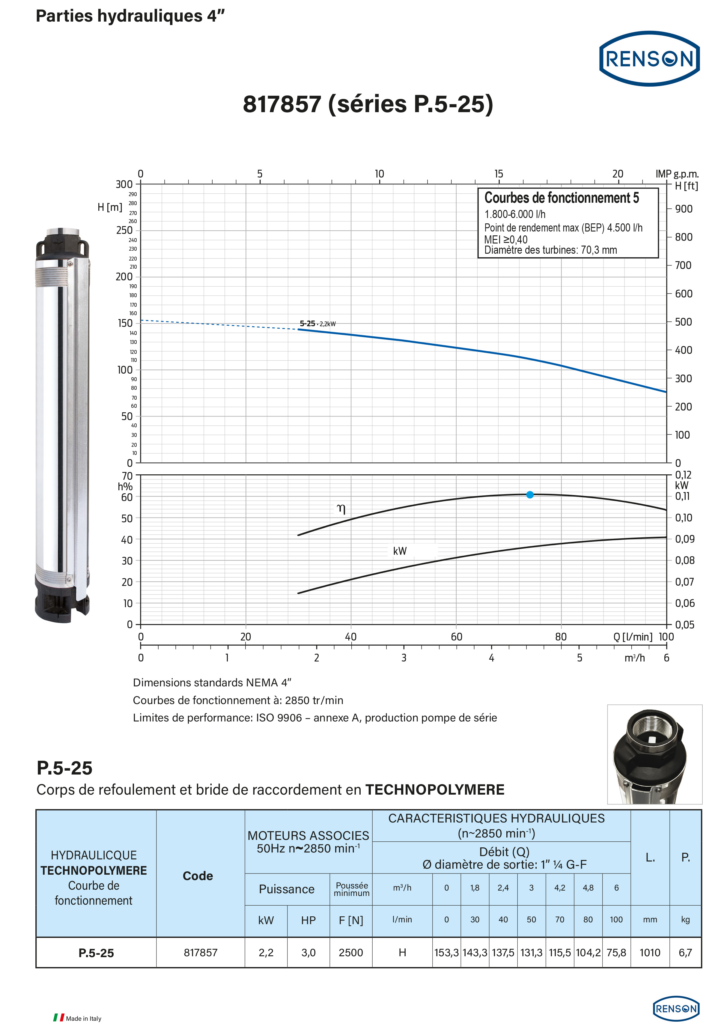 • Corps de refoulement et bride de raccordement en techno polymère, solide et résistant à une eau acide (valeur de ph basse) et à une eau ferrugineuse.