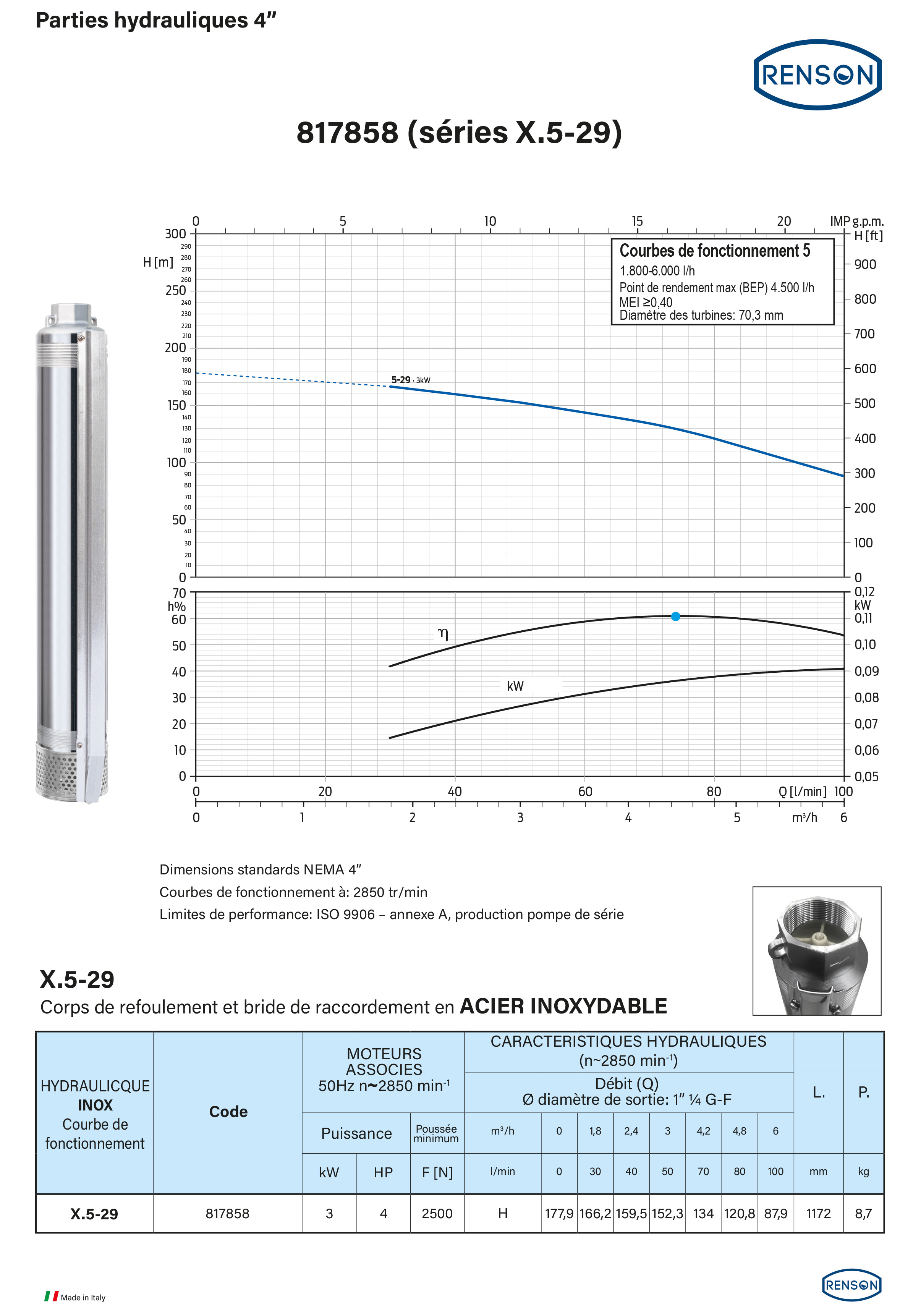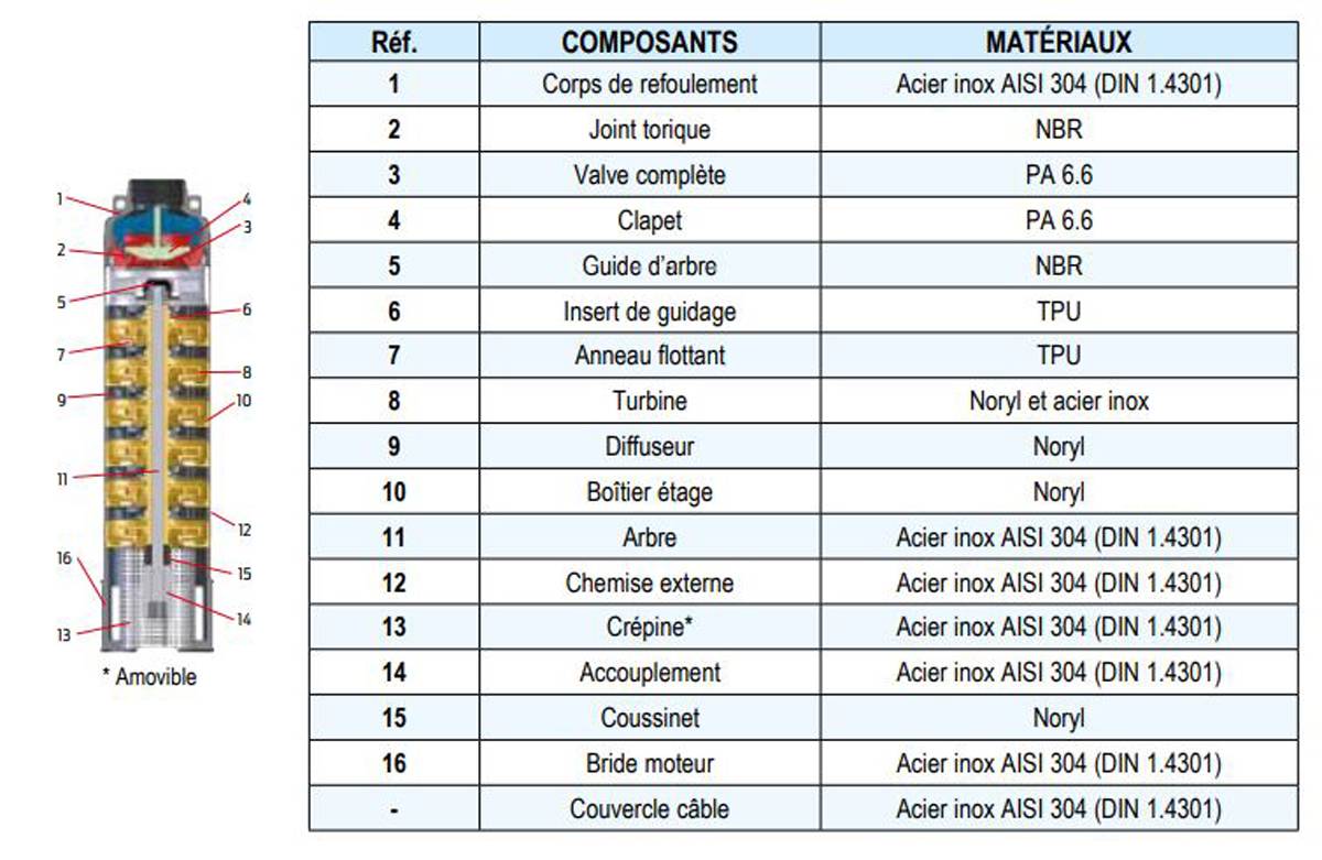 - le corps de refoulement, la bride de raccordement et la crépine en acier inoxydable