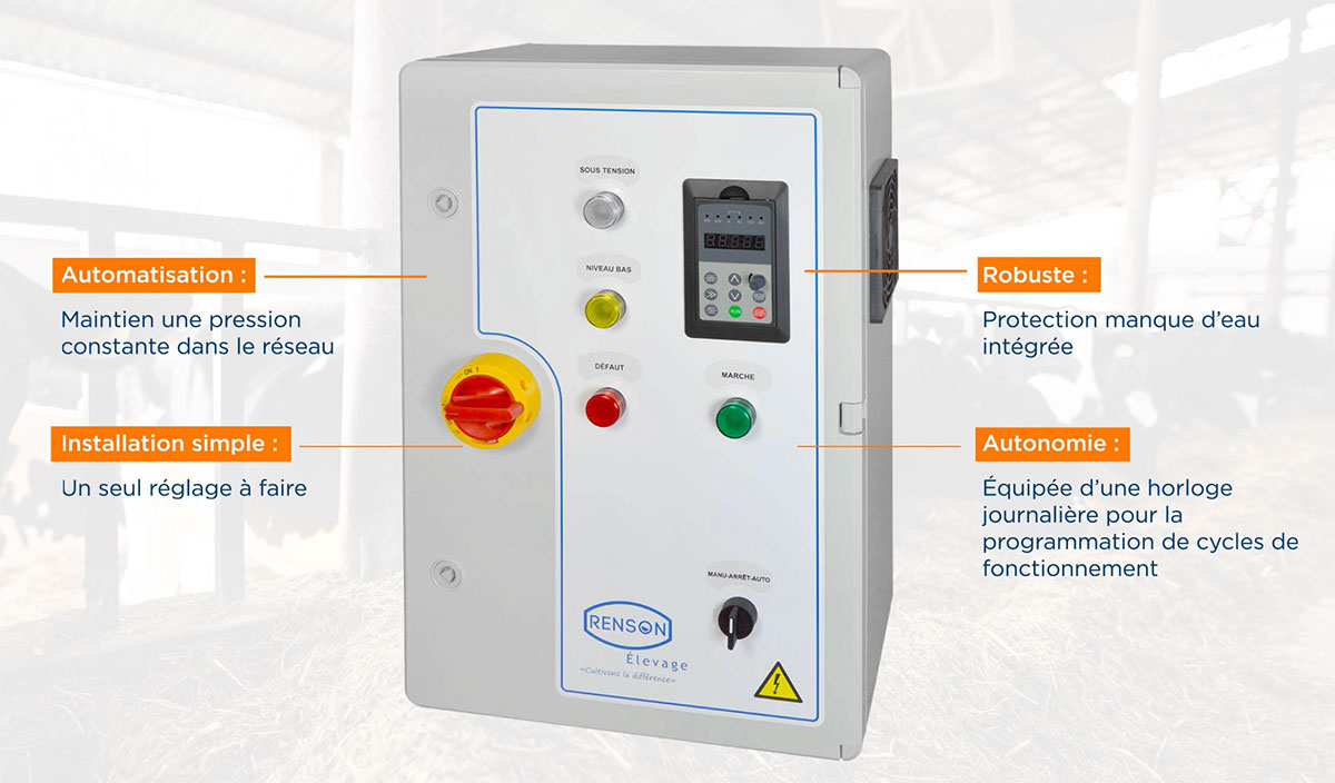 Le variateur de vitesse est déjà pré-réglé, il est dédié à la pompe. Il ne reste que la pression d'utilisation à régler par l'utilisateur, à faire en façade de coffret.