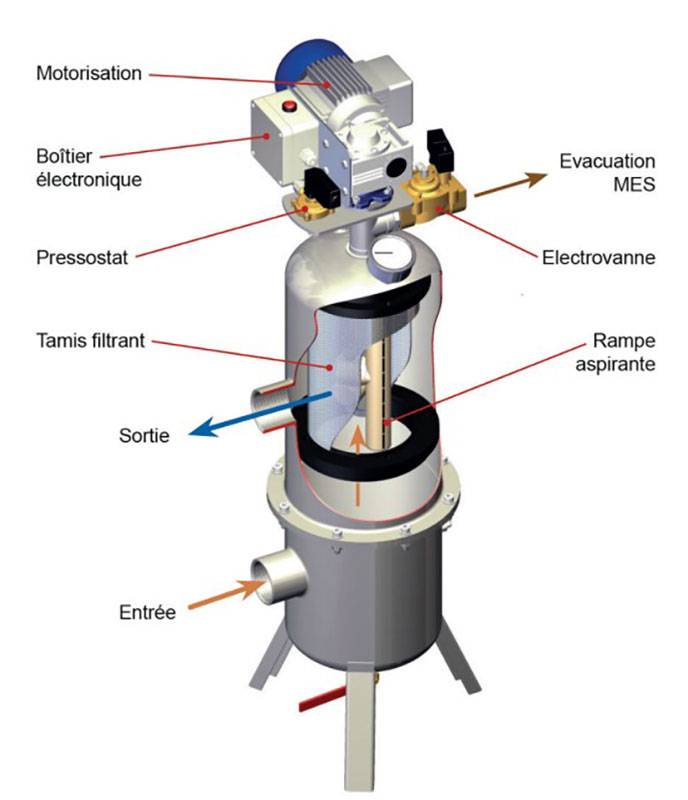 La filtration s’effectue au travers d’un tamis cylindrique.