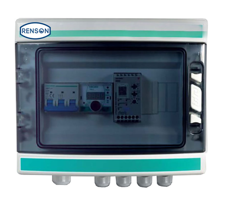 - Sorties auxiliaires : Pompe en marche (PUMP), Manque d’eau (LEVEL) et Défaut thermique (ALARM), 400 VAC, 5 Ampères maximum