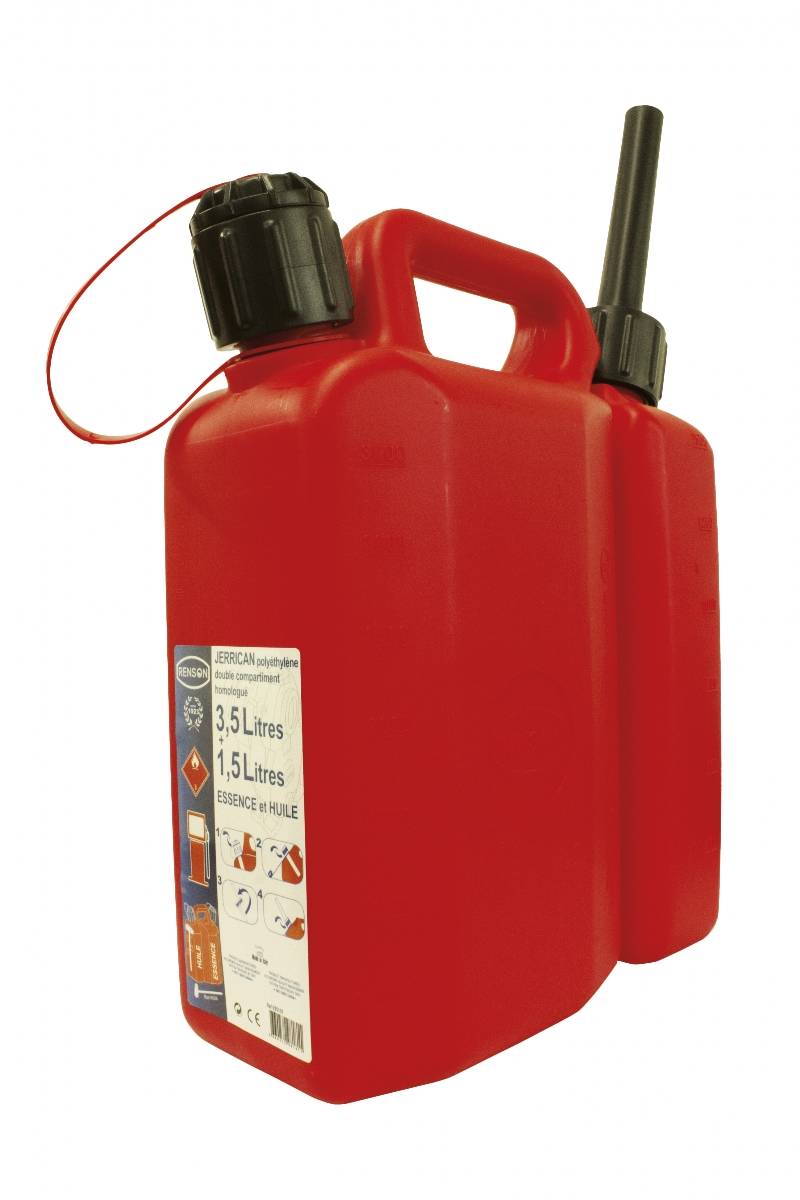 Double compartimentation (3,5L et 1,5L) : Permet de transporter deux types de liquides distincts (par exemple, carburant et huile), tout en évitant les mélanges.